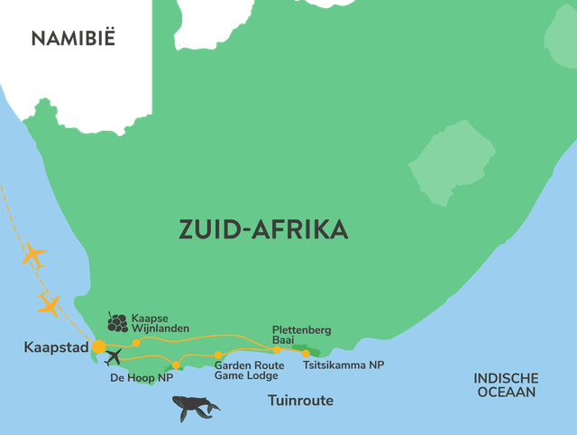 Hoogtepunten tijdens deze reis: Kaapstad – De Hoop of Grootsbos – Plettenbergbaai en Tsitsikamma – Garden Route Game Lodge – Kaapse Wijnlanden