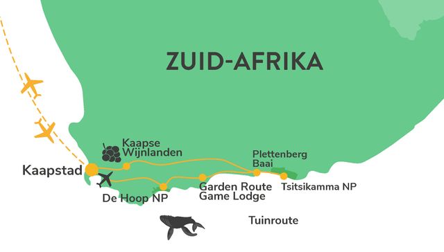 Hoogtepunten tijdens deze reis: Kaapstad – De Hoop of Grootsbos – Plettenberg – Garden Route Game Lodge – Kaapse wijnlanden